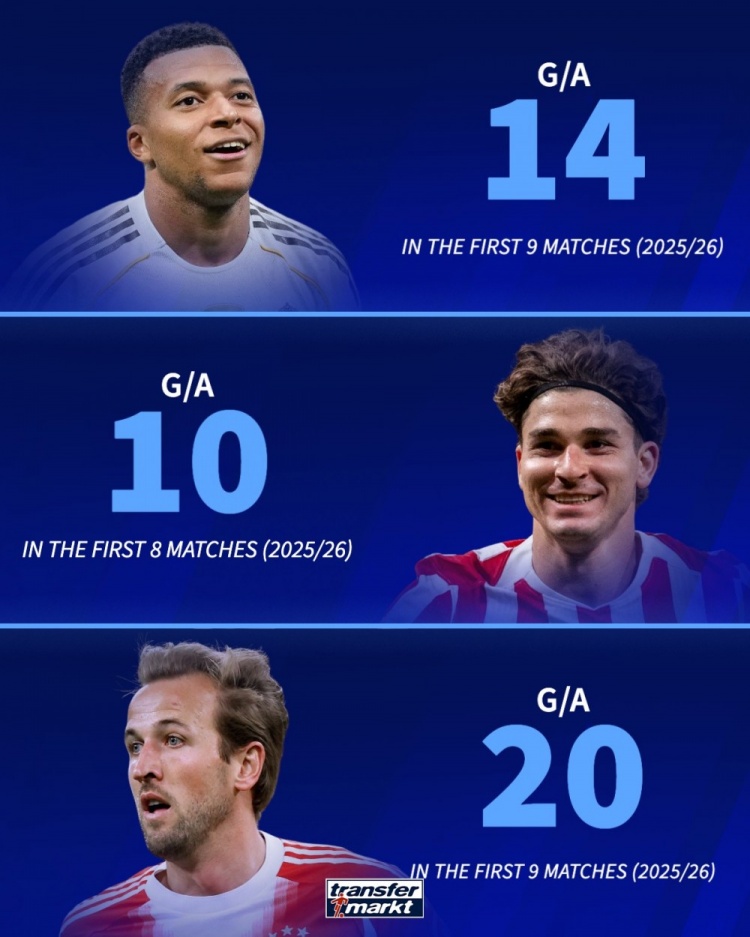10月1日讯 德国转会市集列出凯恩、姆巴佩和阿尔瓦雷斯的焦炙数据,将三东说念主进行对比。
