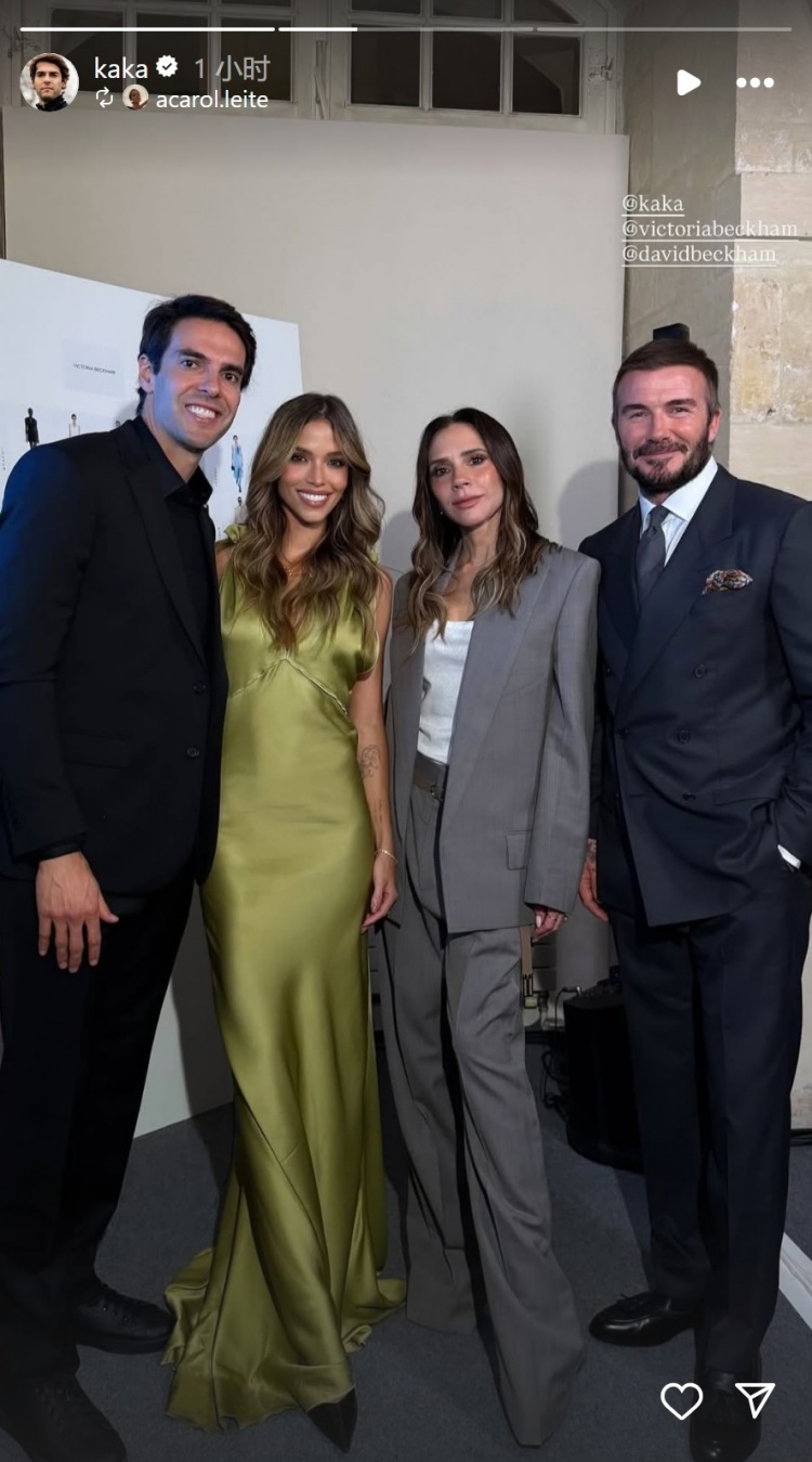 卡卡、贝克汉姆携夫东说念主出席举止,卡卡社媒晒出四东说念主合照。
