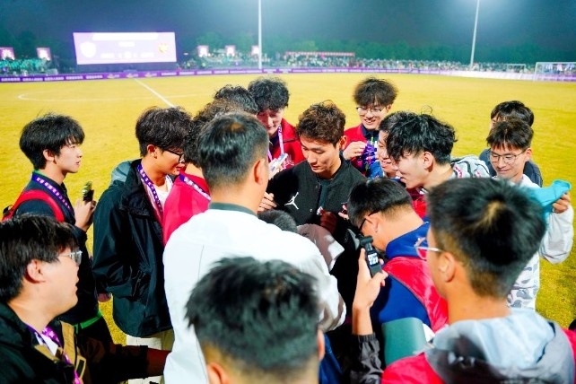 比赛当晚,合肥骆岗公园东谈主声喜悦、热气腾腾。在比赛中场休息技能,安徽蚌埠籍足球畅通员、现役国脚韦世豪亲临现场为赛事助阵,并与合肥、蚌埠、安徽青训三支戎行的队长交换球衣。