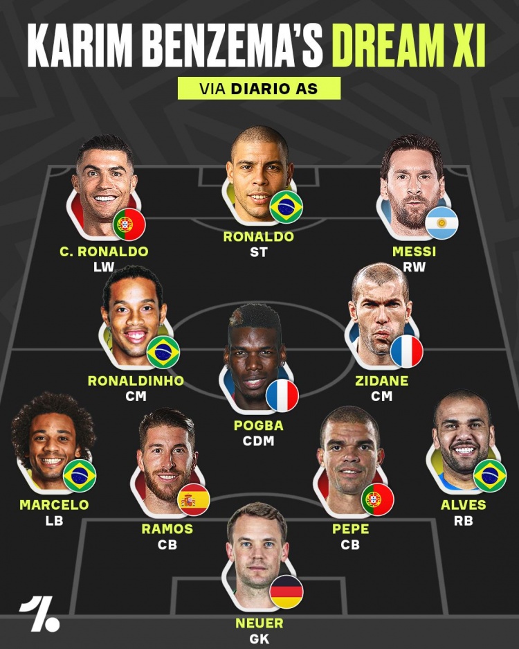 11月20日讯 日前在遴选《阿斯报》采访时,前法国国脚、前皇马时尚、2022年金球先生本泽马评比出我方心目中的足坛历史梦境11东说念主阵。其中,梅西、C罗、大罗三东说念主领衔锋线,小罗、王人达内、博格巴镇守中场。