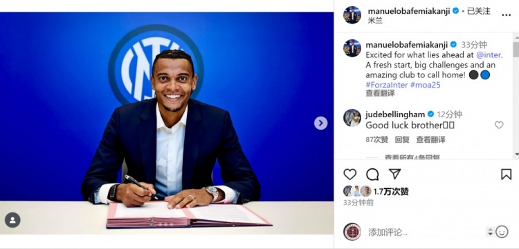 阿坎吉社媒晒出与国米签约的相片,配文:“对行将在国米迎来的新篇章感到振奋。全新的运转,高大的挑战,以及一个我不错称之为家的伟大俱乐部!”