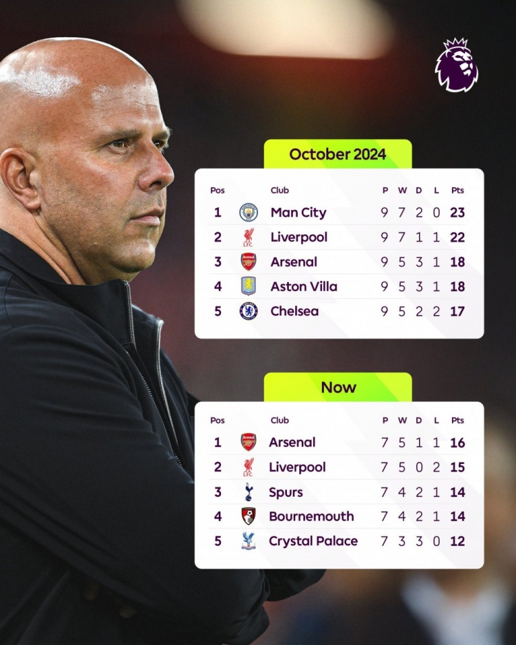 据英超官方统计,2024年10月之后,利物浦初次在比赛周禁止时未能处于英超榜首位置。