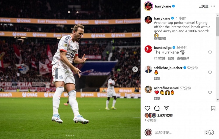 凯恩社媒晒出比赛像片,并写谈:“又一场顶级发达!以一场精彩的客场得胜和全胜战绩迎来海外比赛日。”