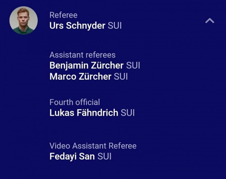 助理裁判:马尔科-苏舍尔(瑞士)、本杰明-苏舍尔(瑞士)