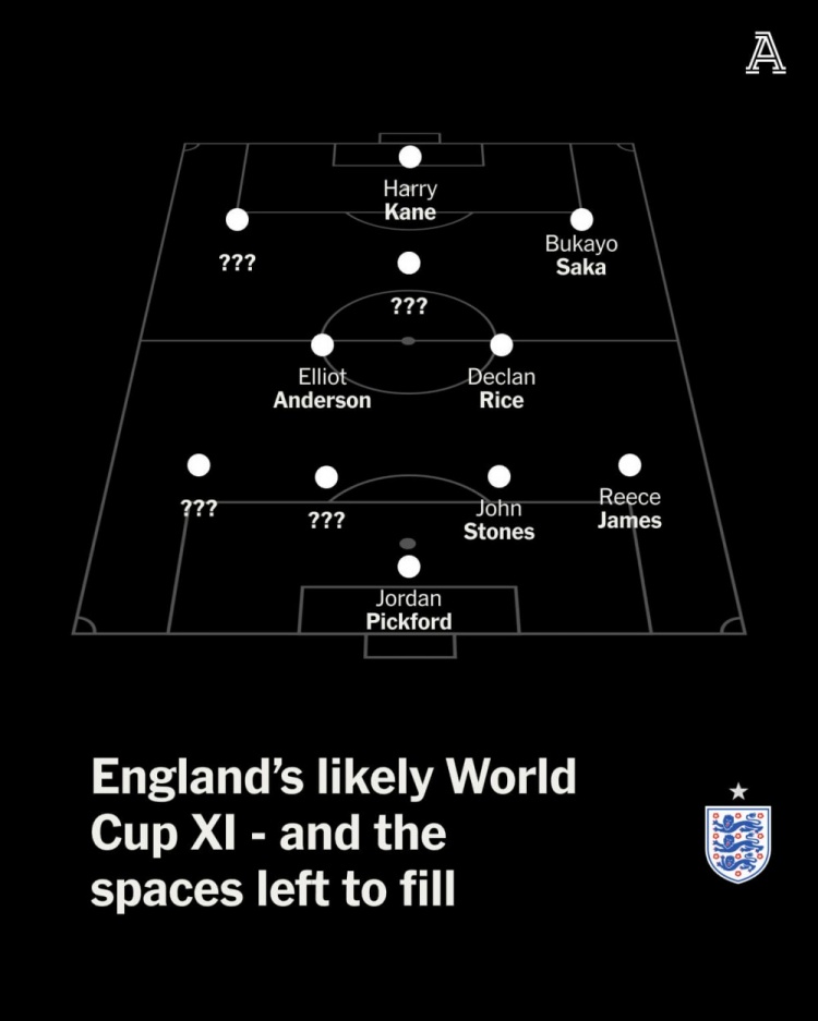 其中,皮克福德将是主力门将,里斯·詹姆斯是主力右后卫,斯通斯细目一个首发中卫位置;中场位置细目了赖斯、埃利奥特·安德森两个首发;前卫位置凯恩、萨卡稳坐首发。