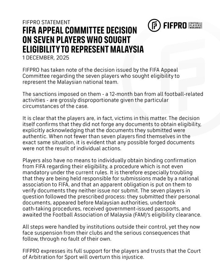 12月1日讯 FIFPro本日发文,声援了被海外足联禁赛12个月的七名马来西亚球员。