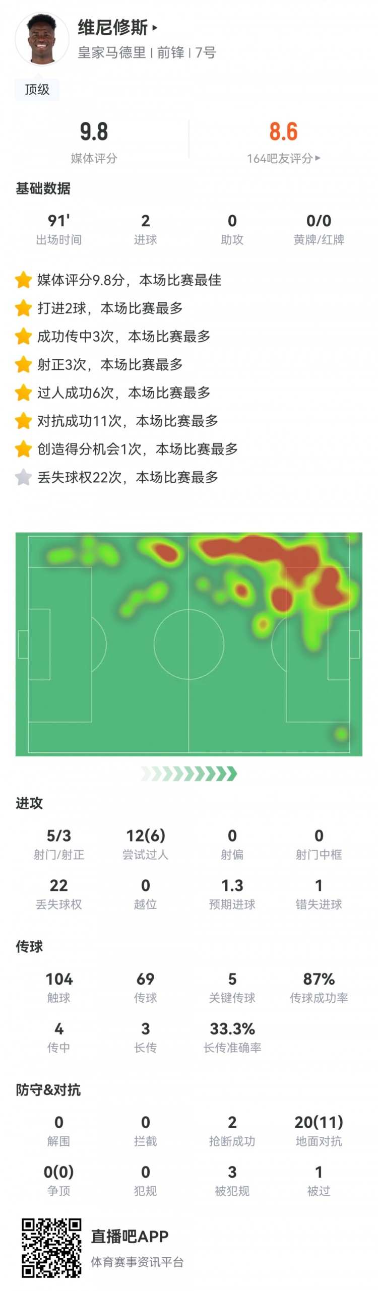 你的位置:意甲直播 > 西甲 > 差极少满分!维尼修斯数据:2粒进球104次触球5次要害传球评分9.8