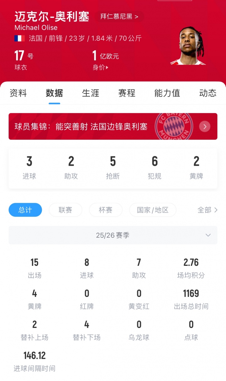 奥利塞现年23岁,司职右边锋,他本赛季为拜仁出战15次,孝敬8球7助,他与拜仁的条约在2029年到期,现身价1亿欧。拜仁方面宣称不测出售奥利塞,并但愿在改日不绝留下他,据悉,奥利塞与拜仁莫得解约金条件。
