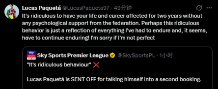 我还是会接续长途,不让这些事情再进一步伤害我。这虽然不行成为我被红牌罚下的借口,是以我要向球迷和队友们真挚谈歉!”