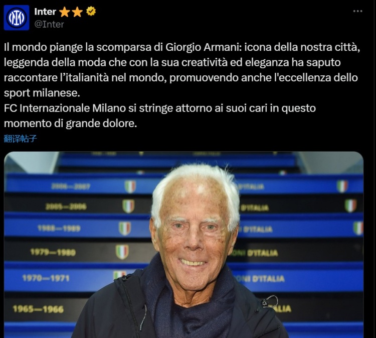 国米官方写说念:“全寰球齐在为乔治-阿玛尼的离世而悲伤:他是咱们城市的记号,是前锋界的传闻东说念主物,以其创意与优雅将意大利精神传递到全寰球,同期也持行了米兰城体育的不凡形象。”