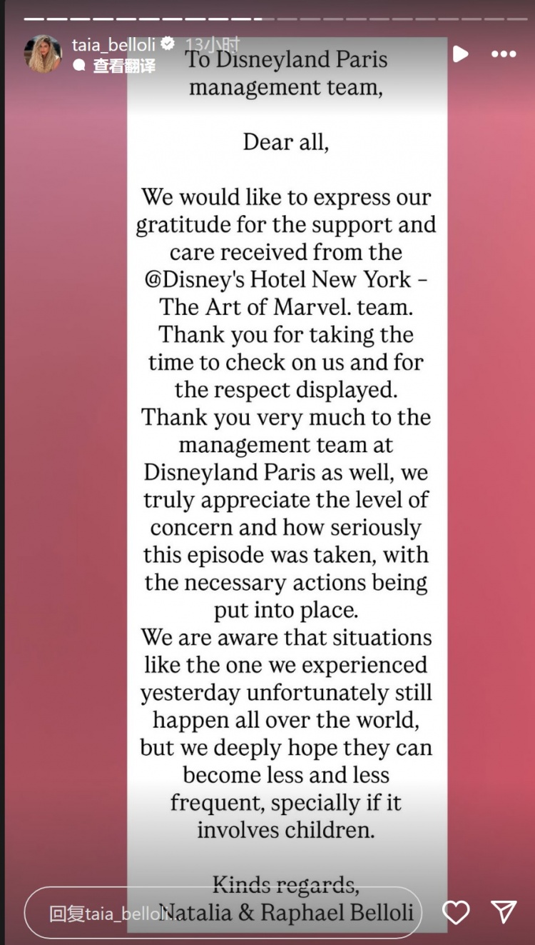 “致巴黎迪士尼乐土处置团队,亲爱的诸位,咱们对纽约迪士尼货仓-漫威艺术的复古和关怀暗示感谢。感谢你们抽出时辰眷注咱们,并展现出尊重。咱们也相等感谢巴黎迪士尼乐土的处置团队,咱们忠实地戴德你们对此事件的爱好以及所继承的必要法式。