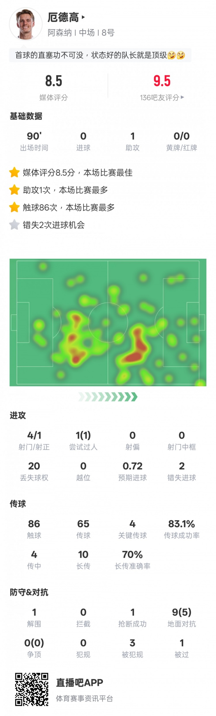 此役厄德高为阿森纳踢满全场,送出1记助攻,阿森纳官方文牍,经由球迷的投票,厄德高当选本场比赛队内最好球员。
