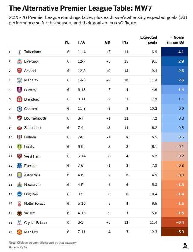 在本赛季英超预期进球值与内容进球值榜单中,热刺是发达最佳的,他们内容进球比预期进球多4.1个,利物浦(2.9个)、阿森纳(2.6个)、曼城(2.6个)分居二至四位。