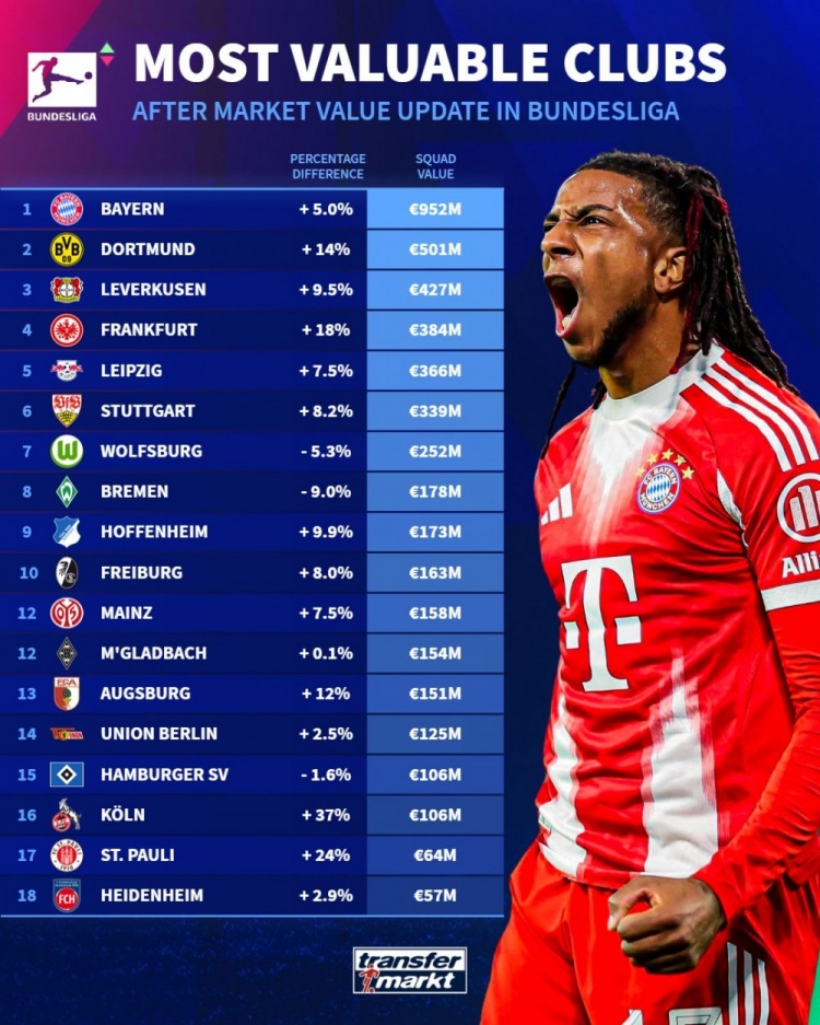 10月15日讯 德转更新了德甲身价,以下为更新后德甲各队身价排行: