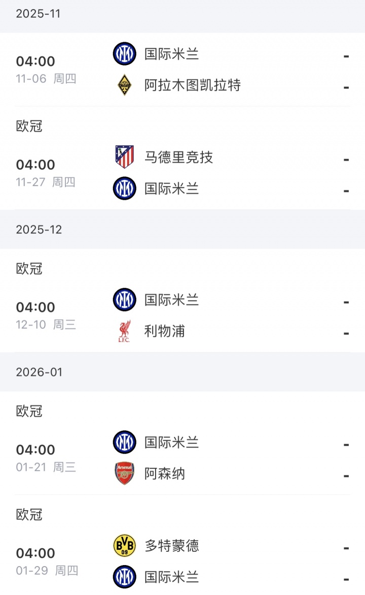 但国米接下来赛程不吉,终末4轮的敌手远隔是马竞、利物浦、阿森纳、多特。