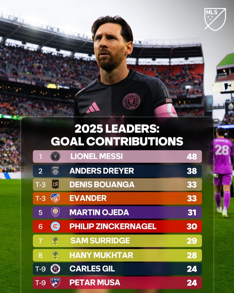 10月22日讯 据好意思职联官方统计,梅西本赛季参与48粒进球,扫数球员中最多。