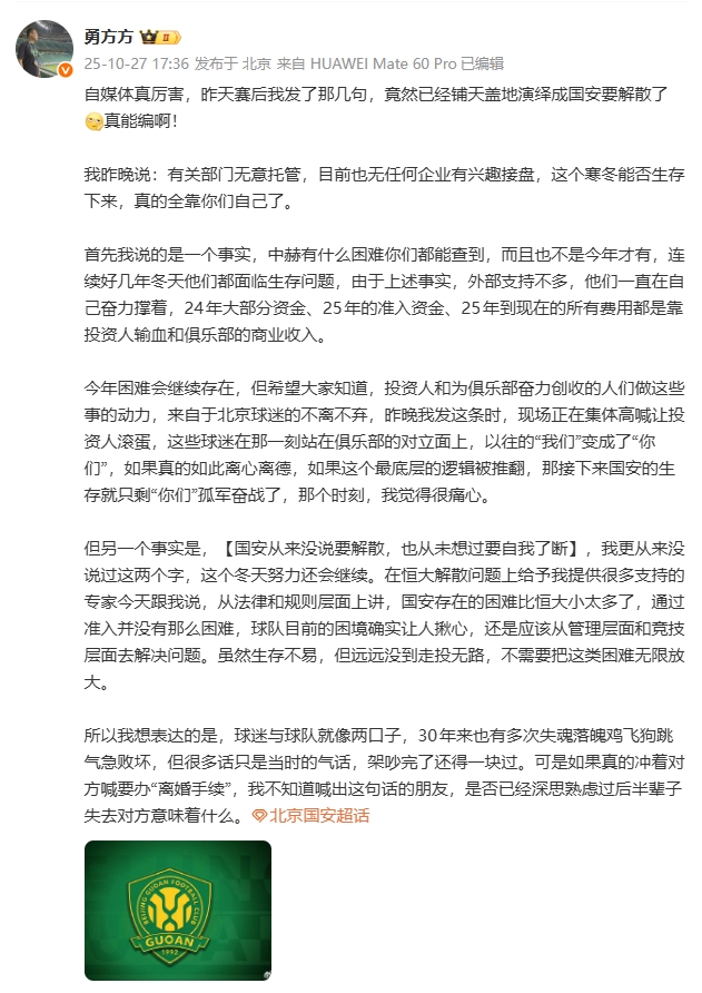 10月27日讯 昨日,媒体勇方方发文谈到了国安如今的境遇欠安激发球迷盘问。当天,该媒体东谈主再次发文澄莹相干昨日的言论。