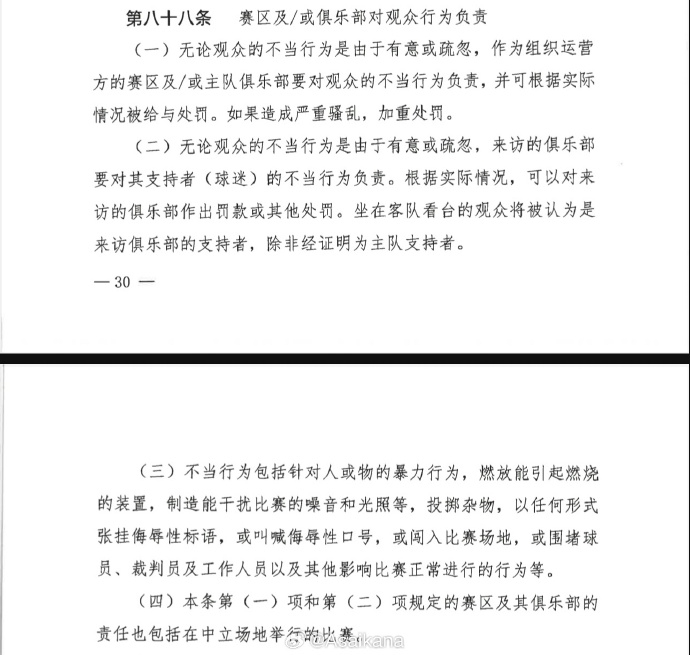 在本年新发布的中足联圭表说念德准则里,“悔过”(包含种族、肤色等悔过当作)是挑升增多的本色,这亦然反应了海外足联严打赛场种族悔过当作的要求。此前,行状联赛种族悔过事件多发,由于短少相应条目或把柄,遵循多不昭彰之或以其他原理替代。但最新文献明文规章,球迷有悔过当作的,一朝把柄可信(一般指可供因循解释其当作的视频摄像、东说念主证、比赛官员的申诉、听证纪录等),其所因循的俱乐部将被处甚至少50万元的渊博罚金,并将根据圭表说念德准则进行进一步处理(关闭部分看台或一齐空场等)。