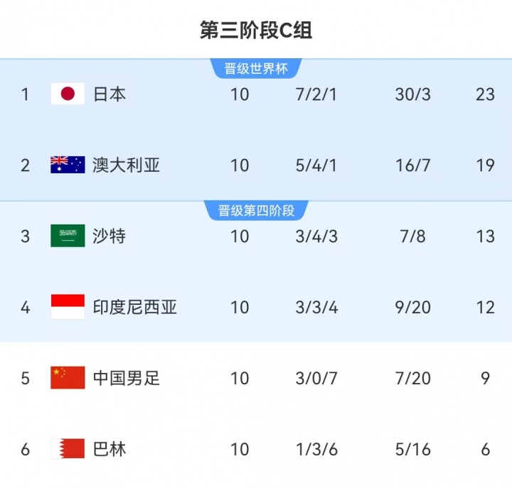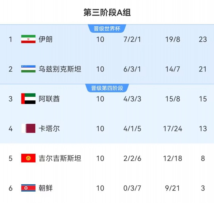 世初赛第3阶段,国足与阿联酋分歧被分至C组、A组;本阶段最终国足积9分排行小组第5无缘晋级下一阶段,阿联酋积15分排行小组第3晋级。