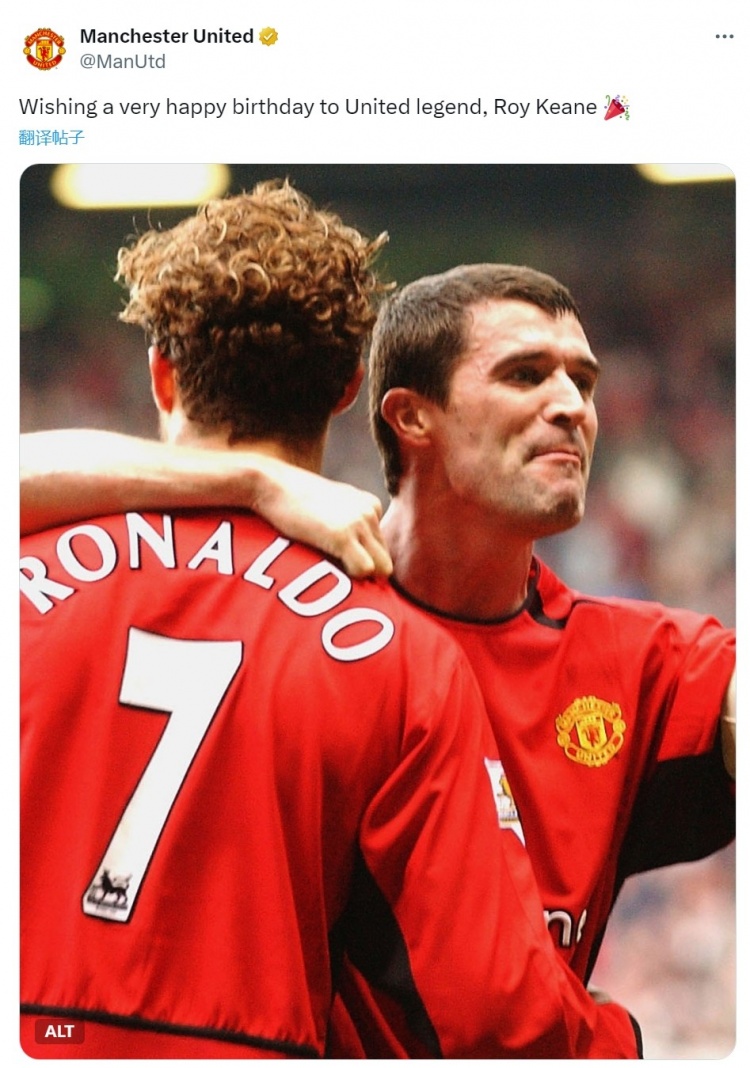 曼联官方社媒晒出罗伊-基恩效用球队时期的像片,配文:“祝曼联据说罗伊-基恩生辰本旨。”