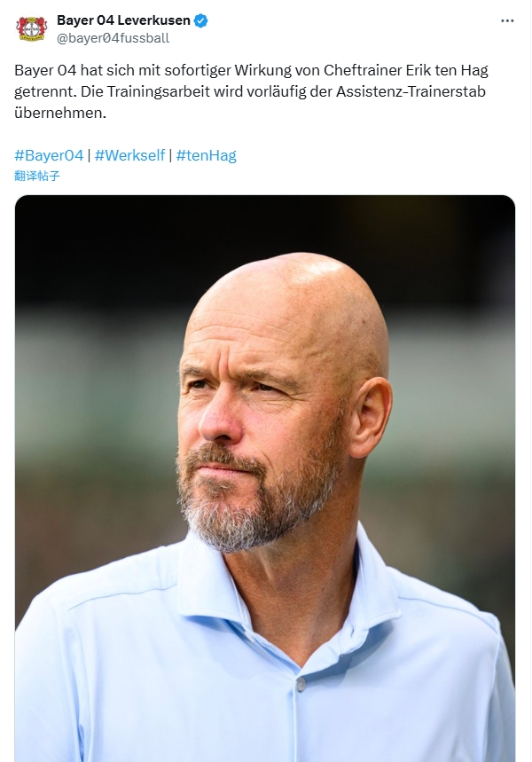 勒沃库森官方:即日起废除埃里克-滕哈赫主西席职务,检会使命暂由助理西席团队接管。