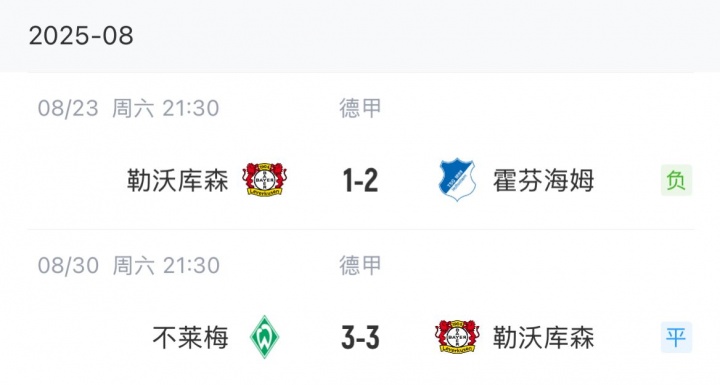 滕哈赫本赛季指挥勒沃库森德甲开赛两轮不堪,只拿到1分。