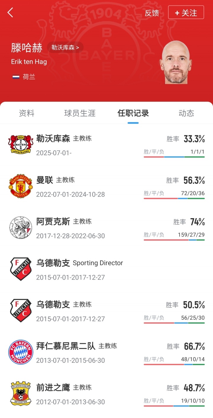 滕哈赫现年55岁,荷兰籍西宾。曾先后抓教前进之鹰、拜仁二队、乌得勒支、阿贾克斯、曼联以及勒沃库森。