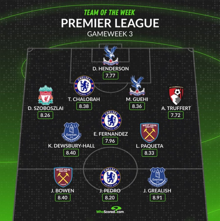 时尚:鲍文(西汉姆,8.40分)、若昂-佩德罗(切尔西,8.20分)、格拉利什(埃弗顿,8.91分)