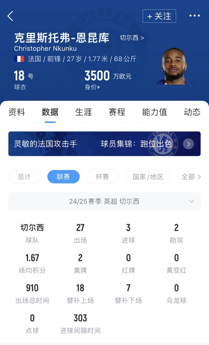 恩昆库现年27岁,与切尔西现存合同在2029年到期,现德转估值为3500万欧。恩昆库2023年夏窗6000万欧从莱比锡加盟切尔西,现在已出场62次,打入18球并有5次助攻。
