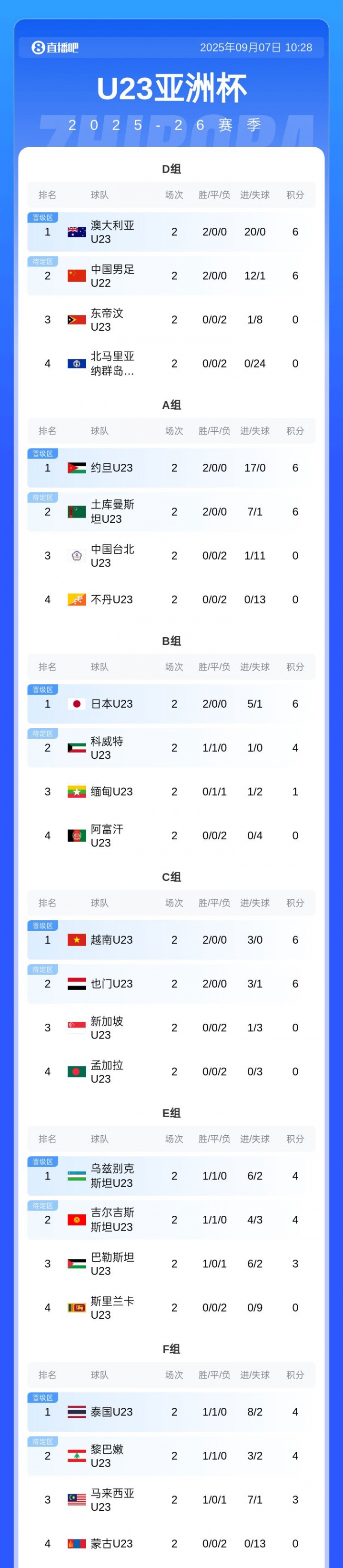 09月07日讯 U23亚初赛前两轮轨则,中国U22国足首场2-1险胜东帝汶,次轮10-0大捷北马里亚纳群岛,当今2胜进12球丢1球积6分排名小组第二,净胜球11球。
