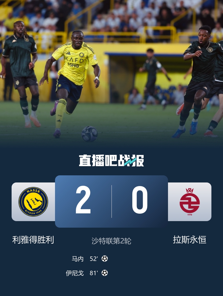 利雅得顺利本轮2-0打败拉斯不灭,本场马内、伊尼戈破门,C罗两次错失好契机。