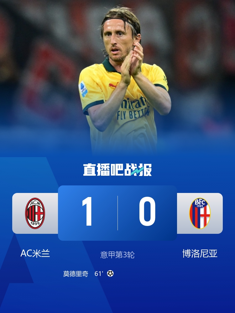米兰本轮1-0打败博洛尼亚,莫德里奇处子球制胜,此外,米兰还遭受了终点逆天的争议判罚。