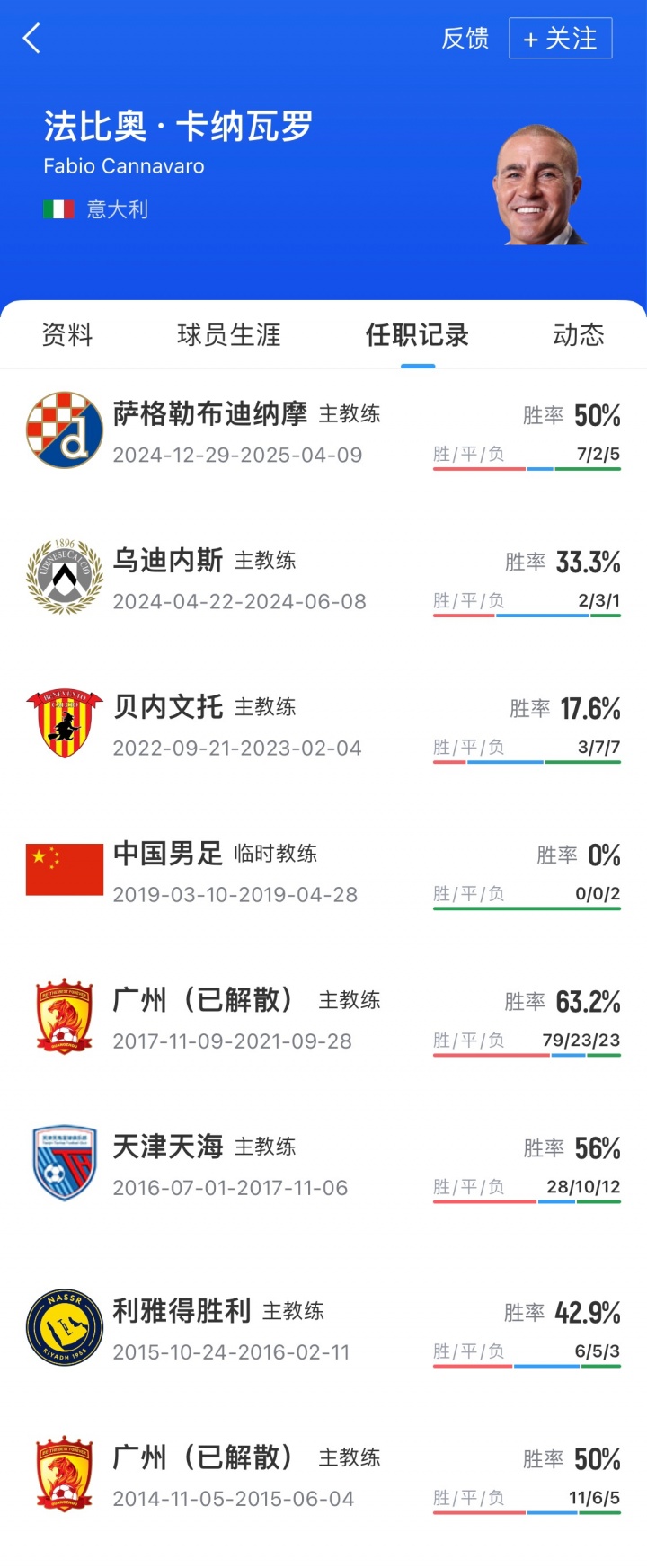 卡纳瓦罗还曾抓教广州恒大,而后还曾归国先后抓教贝内文托和乌迪内斯。