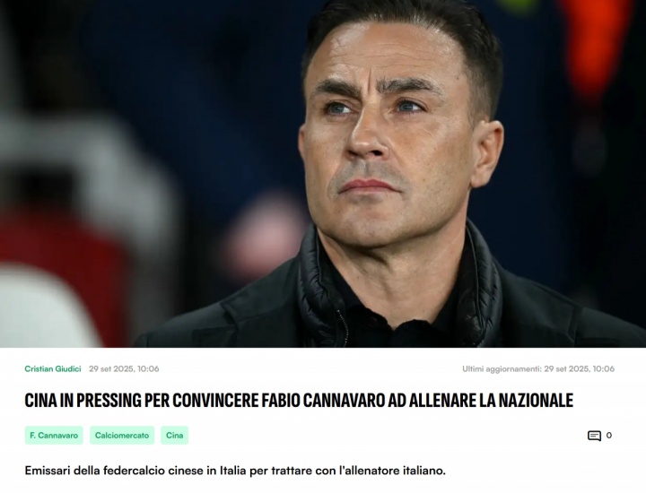 09月29日讯 据意大利足球阛阓记者cristian giudici音尘,中国足协顶住了代表赶赴意大利,正全力与卡纳瓦罗说念判抓教国足事宜。