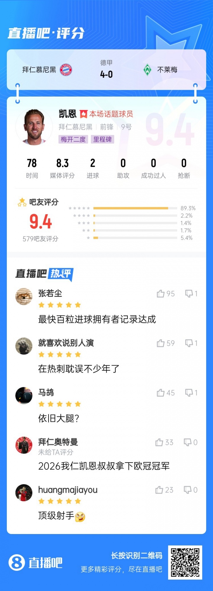 第五轮评比效果结出炉,凯恩梅开二度斩获个东说念主拜仁百球,匡助拜仁4-0打败不莱梅,取得吧友4万多票支撑,当选【X小红书德甲第5轮最好球员】!