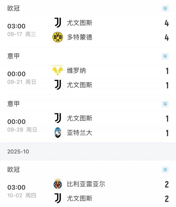 10月02日讯 欧冠联赛阶段第2轮尤文客场2-2遭黄潜绝平,当今尤文已际遇4连平,追平上赛季最长平局记录!