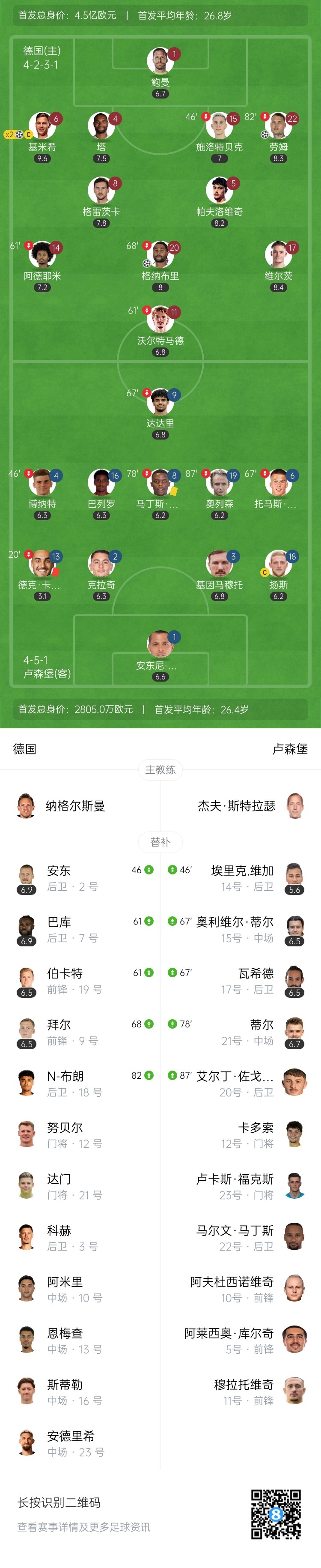 德国队上一场首发如下: