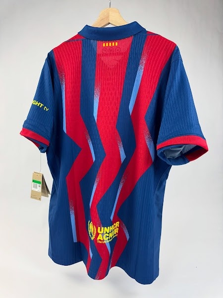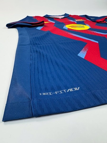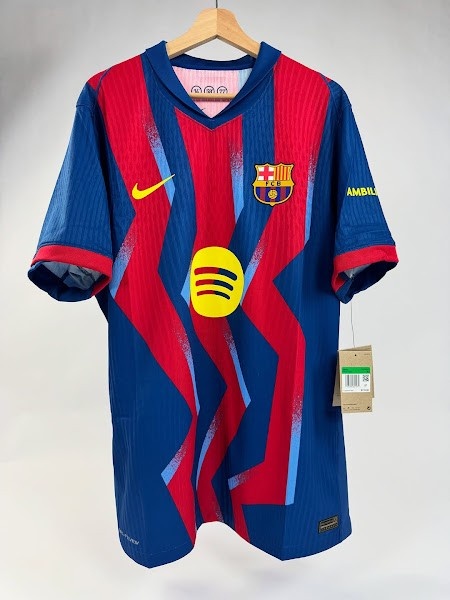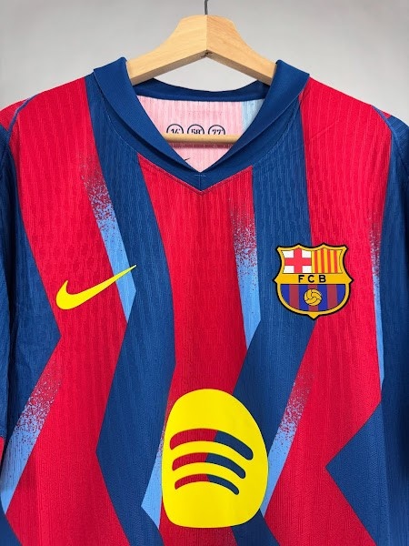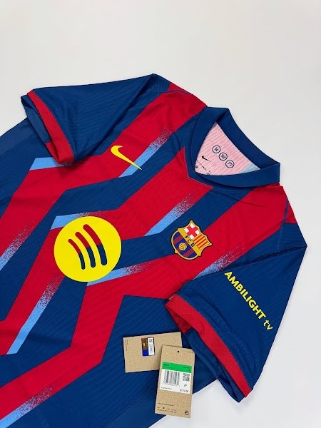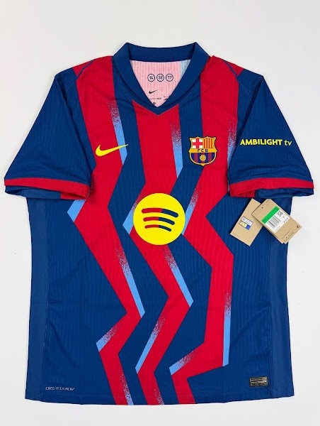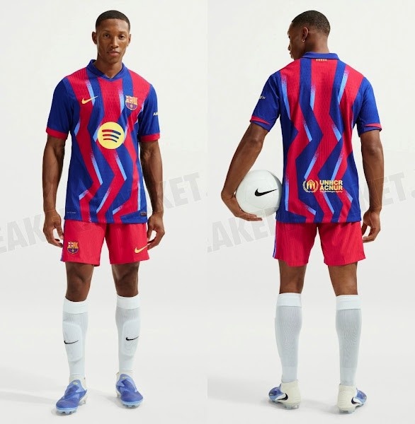 与20年前的经典蓝红条纹不同,巴塞罗那2025-26赛季第四球衣接受了蓝色和红色的锯齿形条纹,并带有浅蓝色的图形元素。