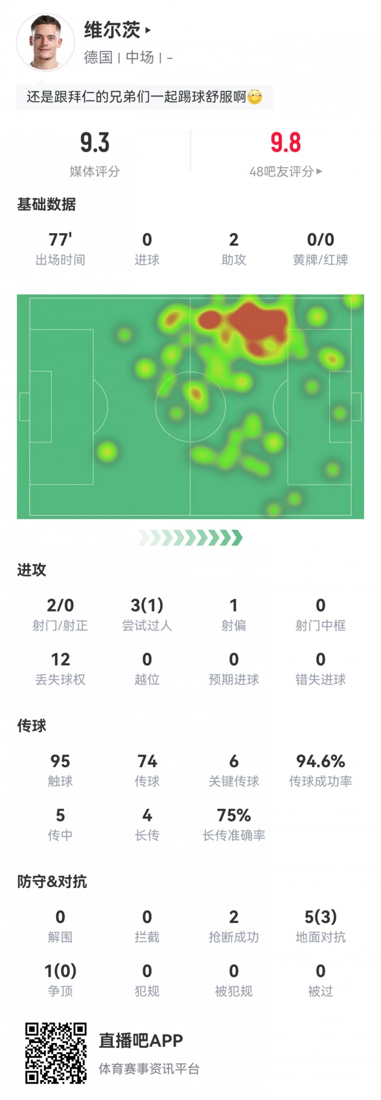 11月18日讯 正在进行的世初赛,德国6-0杰出斯洛伐克。此役维尔茨首发77分钟被换下,球员全场重心数据如下↓