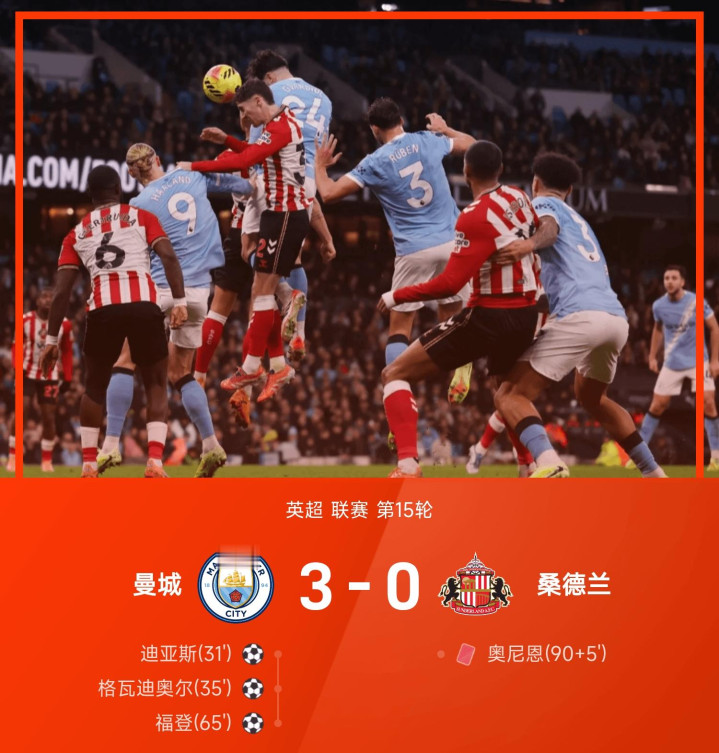 25-26赛季英超第15轮,曼城镇守伊蒂哈德球场迎战桑德兰。此役上半场,迪亚斯远射破门轰入寰宇波助曼城破裂僵局,格瓦迪奥尔策应福登角球传中争顶破门再入一球。易边再战,福登策应谢尔基传中冲顶立功,奥尼恩补时阶段染红被罚下。全场比赛截止,曼城3-0桑德兰,手执31分持续名次积分榜次席且仅落伍领头羊阿森纳(33分)2分。