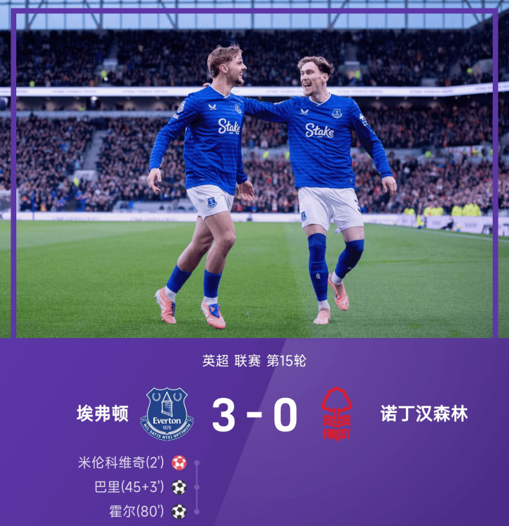 25/26赛季英超联赛第15轮,埃弗顿主场对阵诺丁汉丛林。上半场,开局2分钟米伦科维奇头球打进自家球门,埃弗顿梦境开局。上半场补时读秒阶段,巴里推射破门打进本赛季第一粒进球。下半时易边再战,第80分钟霍尔低射破门将战局锁定。最终,埃弗顿3-0大捷诺丁汉丛林。