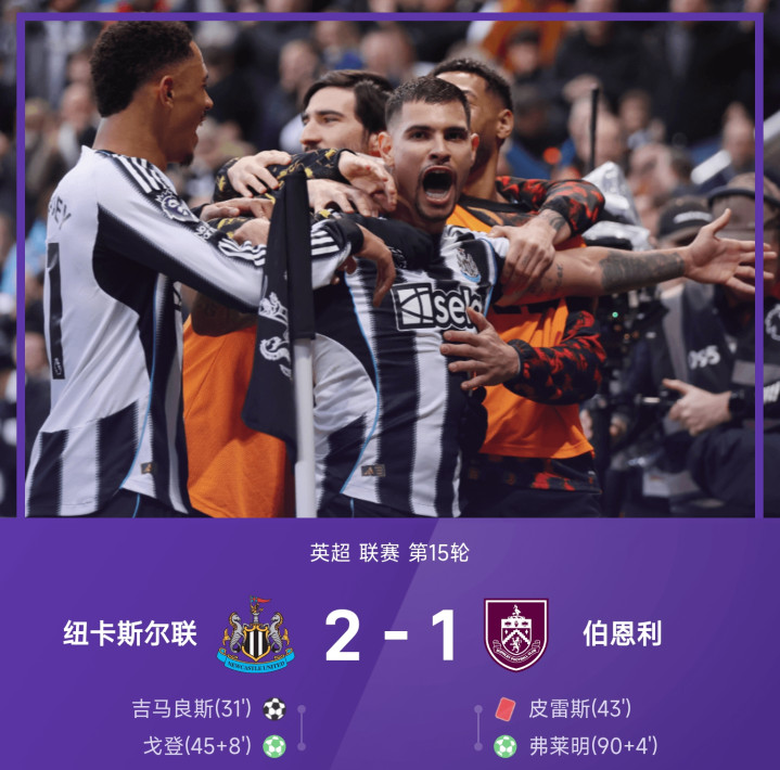 25/26赛季英超联赛第15轮,纽卡斯尔联主场迎战伯恩利。吉马良斯平直角球破门先拔头筹。随后,卢卡斯-皮雷斯放倒埃兰加吃到红牌。乌戈舒库手球送点,安东尼-戈登点球掷中。尾声阶段,拉姆塞手球送点,弗莱明点射扳回一城。最终,纽卡斯尔联主场2-1降服伯恩利。
