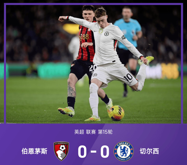 25/26赛季英超联赛第15轮,伯恩茅斯0-0互交白卷闷平切尔西。上半场开场塞梅尼奥闪击破门,但VAR表示埃瓦尼尔森越位在先,进球无效。下半场加纳乔头球中柱,两边均无确立。最终,切尔西客场0-0闷平伯恩茅斯。两边数据,切尔西在进犯方面齐莫得伯恩茅斯积极,全场伯恩茅斯11次射门,切尔西只是10次射门,切尔西最近遭遇瓶颈期。