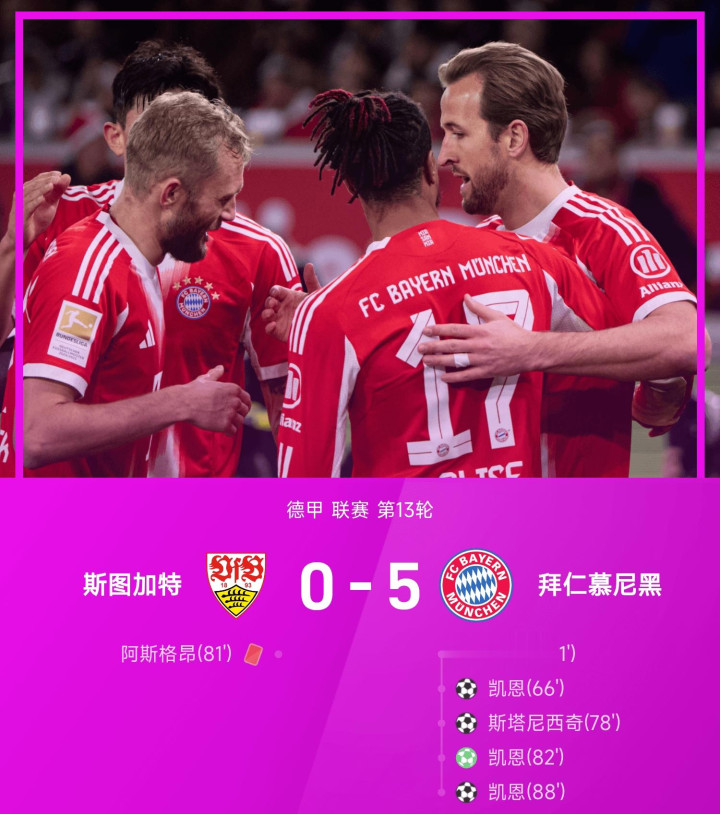 12月07日 25/26赛季德甲联赛第13轮,斯图加特主场迎战拜仁。上半场比赛莱默尔破门,下半场拜仁换上凯恩后,场优势波突变,凯恩赶快戴帽,斯塔尼西奇也破门立功,阿斯格昂染红。最终全场比赛截止,拜仁5-0大捷10东说念主作战的斯图加特。
