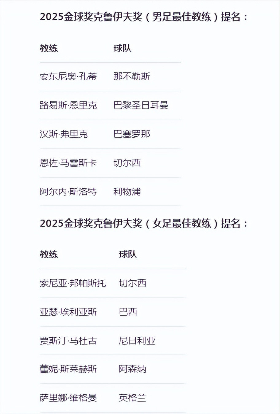 北京本领8月7日,2025年金球奖各奖项候选东谈主名单揭晓。备受瞩诡计年度最好素质奖项(即克鲁伊夫奖)提名也已公布,该奖项旨在赏赐往常一个赛季发达最隆起的男女足球队主素质。