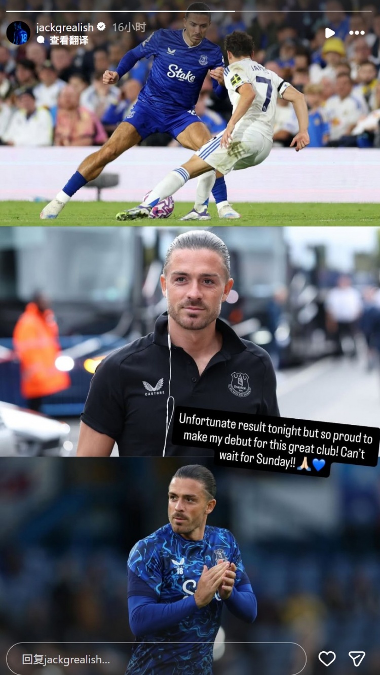 格拉利什在个东谈主社媒晒出本场相片,配文写谈:“很横祸今晚比赛遵守灾祸,可是很自重为 这支拨色的球队完成首秀,也曾等不足周日的比赛了。”