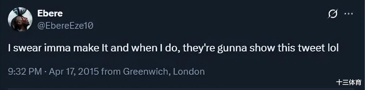 而一条出自 2015年4月 的推文被重新翻出,让东谈主思潮腾涌——那时他以16岁之龄被阿森纳淘汰的少年埃泽写下:“I swear imma make it and when I do, they're gunna show this tweet lol”(“我发誓我会到手,到技术他们会拿出这条推文的,哈哈”)。