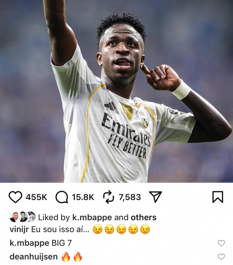 你的位置:意甲直播 > 英超 > 维尼修斯社媒晒照庆祝奏效,姆巴佩点赞接洽:BIG 7