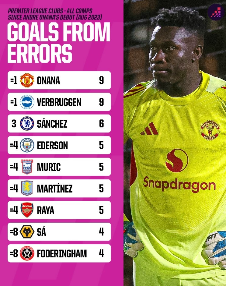 9月9日讯 曼联门将奥纳纳离队在即,OPTA也盘货了自奥纳纳2023年8月加盟曼联以来,英超系数门将在各项赛事出现诞妄导致失球数,奥纳纳并排最多。具体如下: