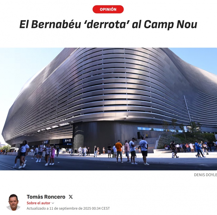 《阿斯报》副主编、闻明皇马球迷龙赛罗借此契机撰文讪笑了巴萨的主场开发,著作本体如下: